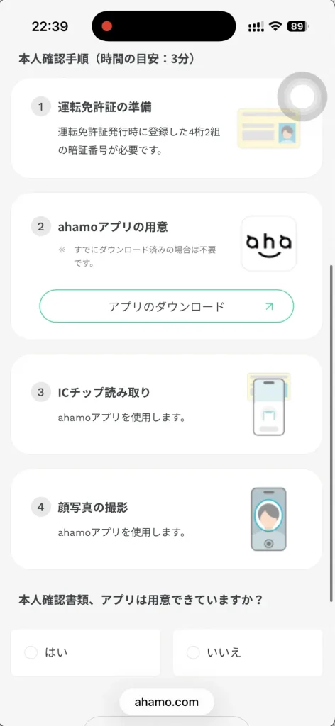 ahamo公式サイトには、マイナンバーカードを利用した本人確認手順の動画が載っているので、マイナンバーカードを利用予定の方は、こちらもご覧ください。